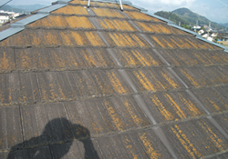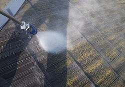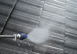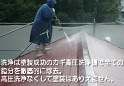 洗浄は屋根や壁に付着している油分などの汚染物質を洗い流し塗料の乗りを良くするためのものです。